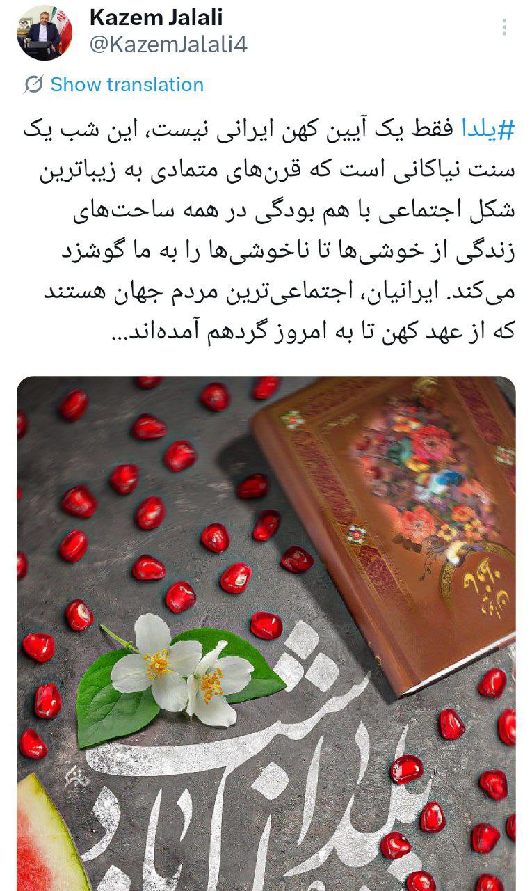 تبریک توییتری سفیر ج.ا.ایران در روسیه به مناسبت شب یلدا در شبکه ایکس