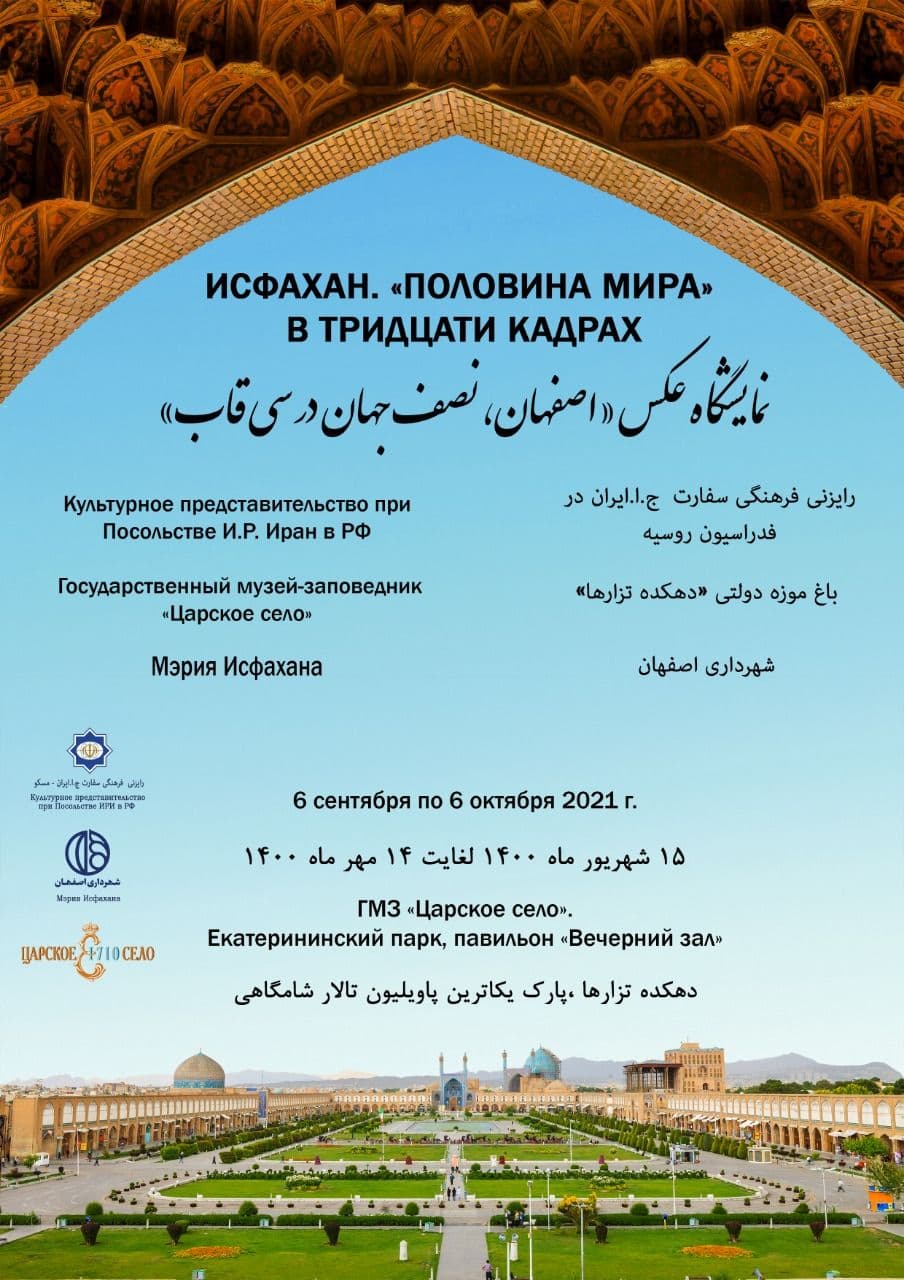 В рамках культурного и художественного сотрудничества городов-побратимов Исфахана и Санкт-Петербурга фотовыставка «Исфахан - половина мира в тридцати кадрах», посвященная славе иранской архитектуры, проведена советником по культуре посольства Ирана в России, Главного управления культурного и художественного сотрудничества Организации исламской культуры и коммуникации, Мэрии Исфахана и ГМЗ «Царское село» и будет работать в течение месяца с понедельника, 6 сентября, в Царском селе, Екатерининском парке и павильоне «Вечерний зал».