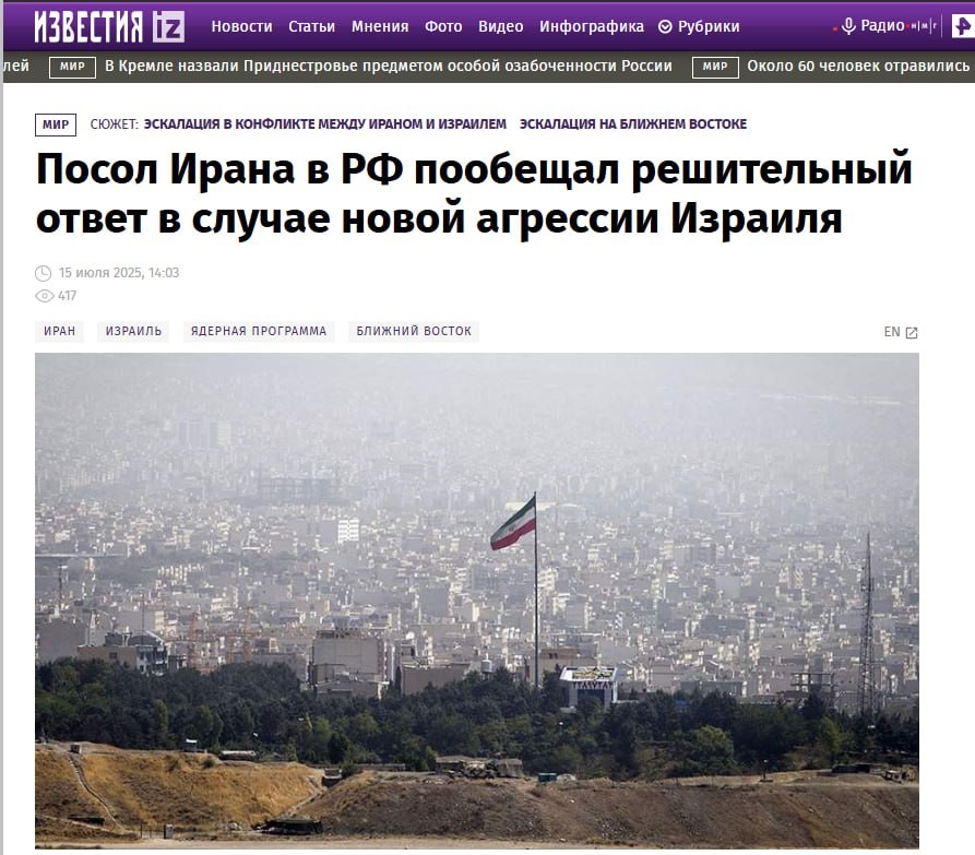 Иран готов оказать ответ в случае новой агрессии со стороны Израиля. Об этом во вторник, 15 июля, «Известиям» рассказал иранский посол в России Казем Джалали.