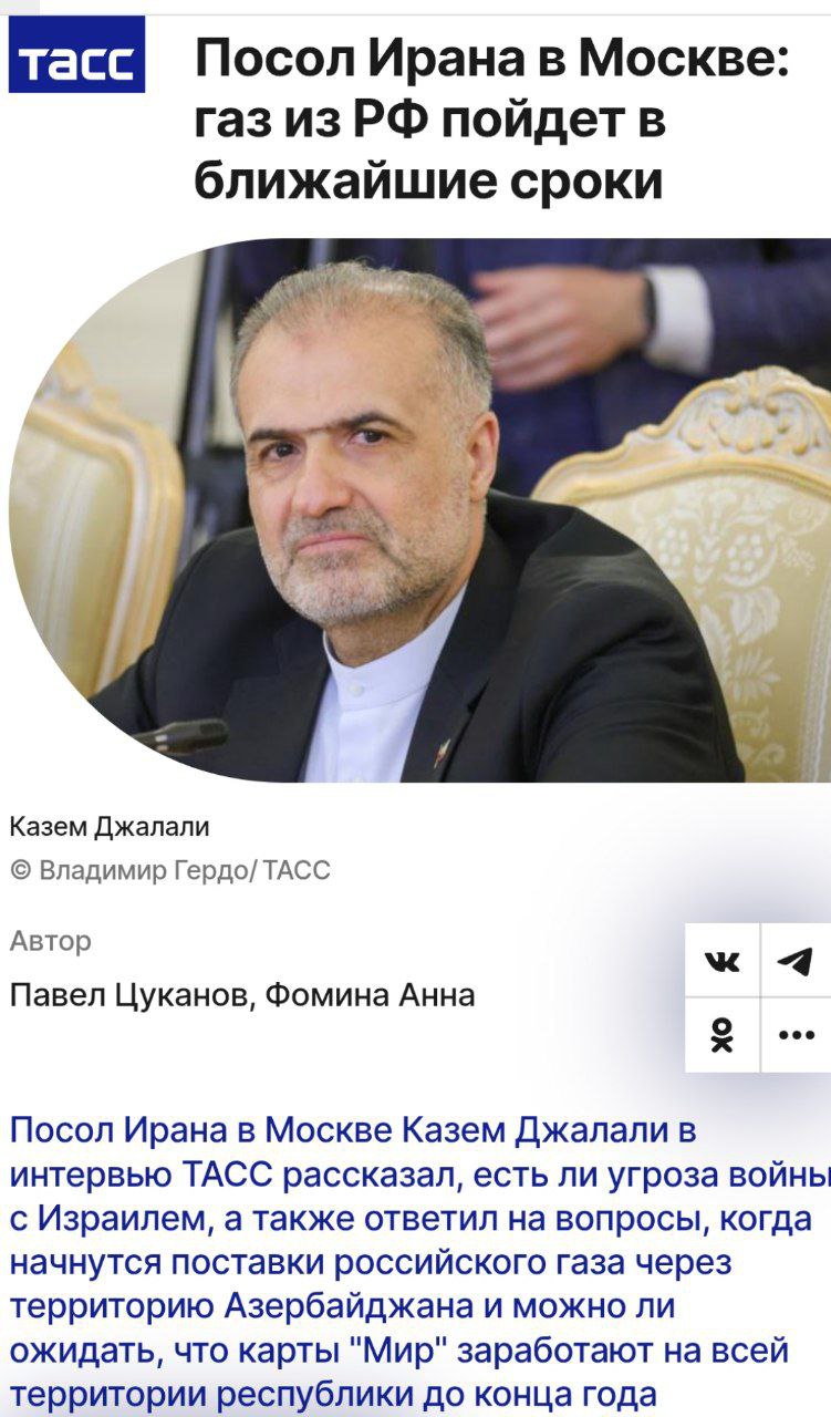 Посол Ирана в Москве Казем Джалали в интервью ТАСС рассказал есть ли угроза войны с Израилем а также ответил на вопросы когда начнутся поставки российского газа через территорию Азербайджана и можно ли ожидать что карты Мир заработают на всей территории республики до конца года