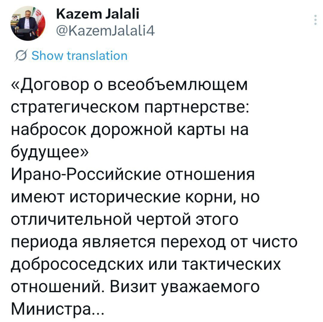 Ирано-Российские отношения имеют исторические корни, но отличительной чертой этого периода является переход от чисто добрососедских или тактических отношений. Визит уважаемого Министра иностранных дел нашей страны, г-на доктора Арагчи, в Москву можно описать и проанализировать именно в этом контексте: мы движемся к всеобъемлющему стратегическому партнерству, гарантирующему долгосрочные интересы как государств, так и народов.